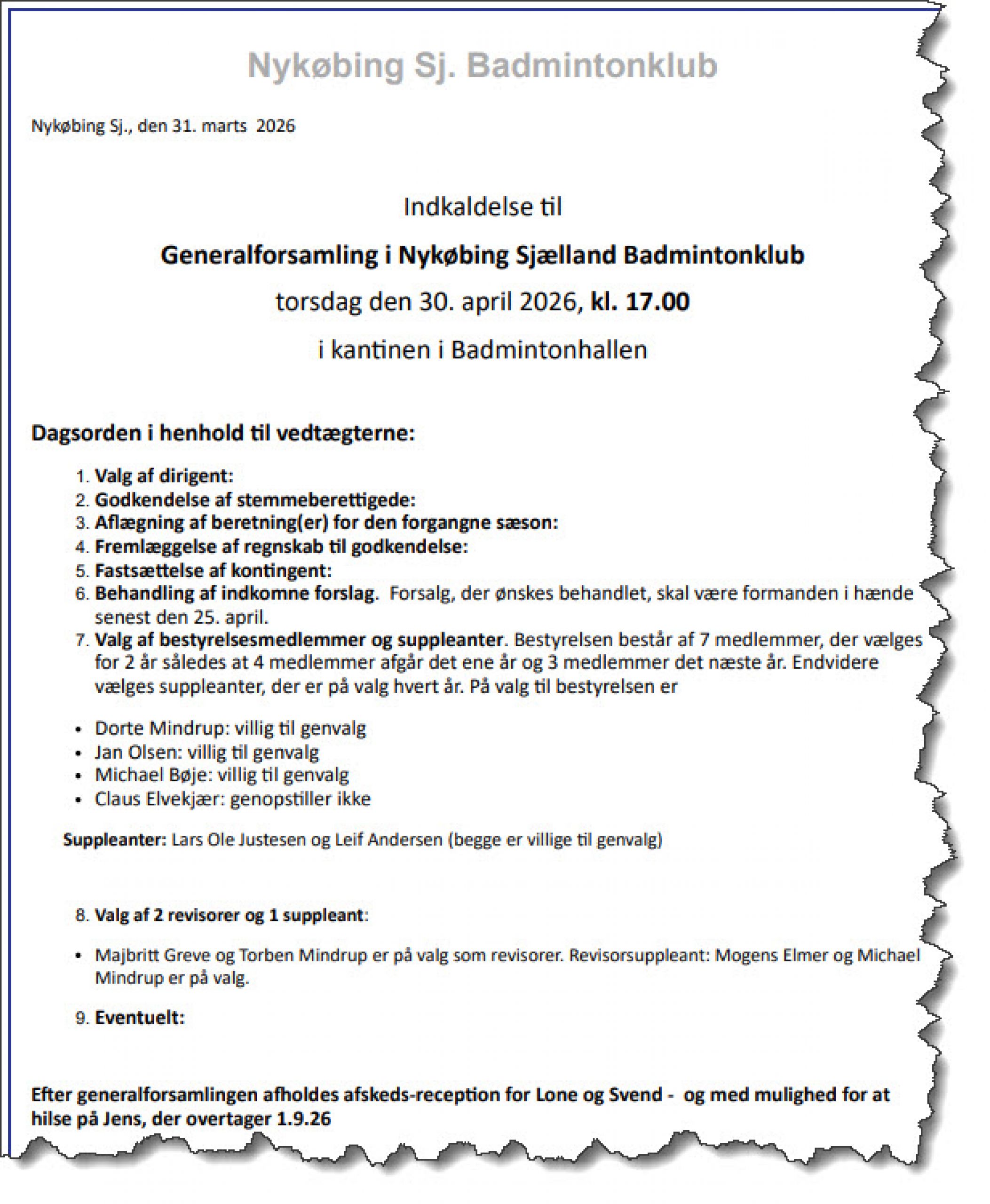 Indkaldelse til Generalforsamling i Nykøbing Sjælland Badmintonklub